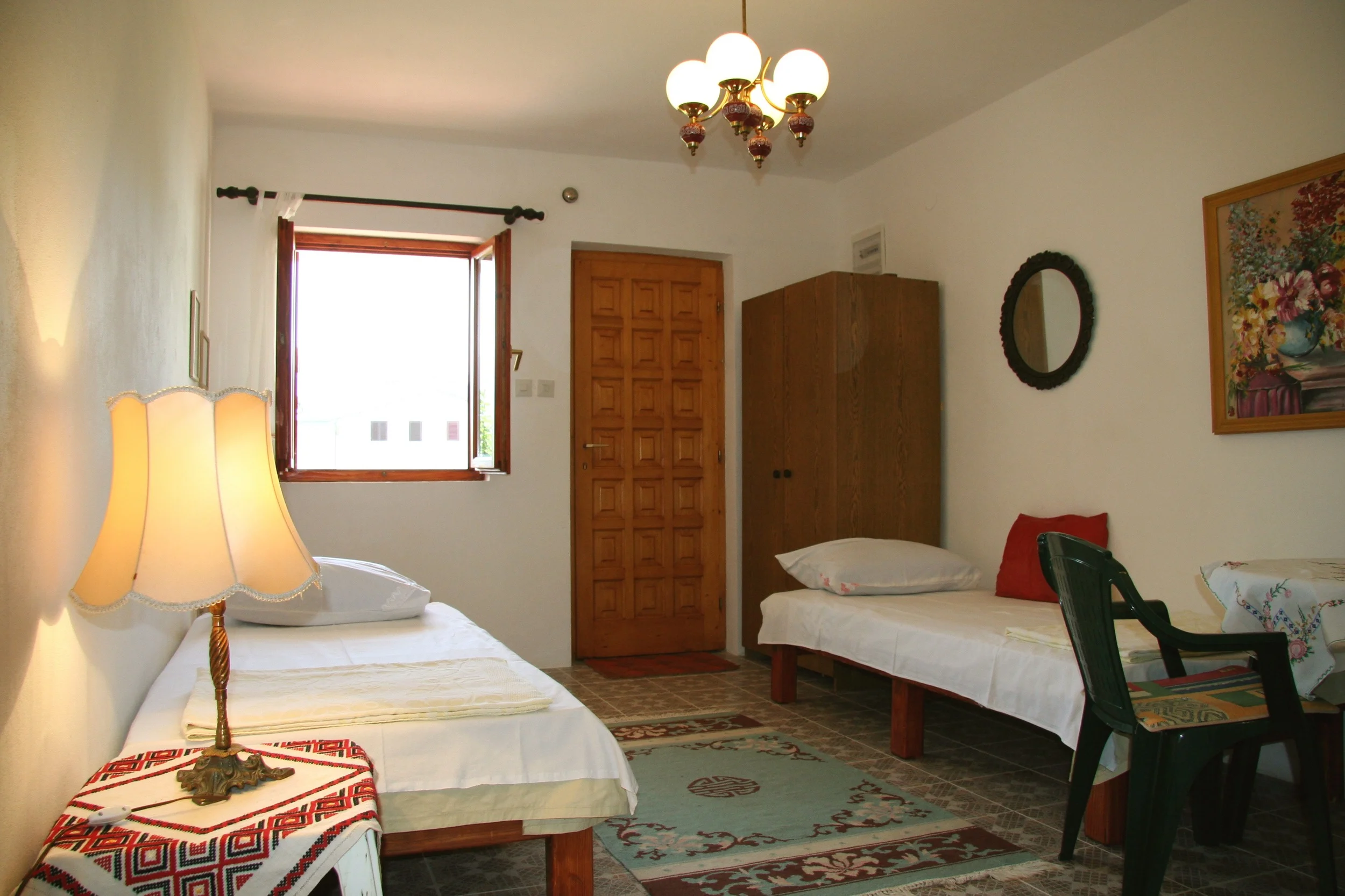 This apartment is located on the first floor of the house. It is comfortable and cosy and has a walk out to a garden. It accommodates 2 people. Price per night: 40 Euros.